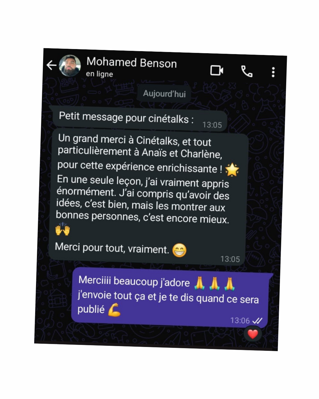 “Ma séance avec Charlène a été très enrichissante. Je ressentais le besoin d'avoir l'avis d'une professionnelle sur mon projet de long-métrage. Charlène a su parfaitement identifier les points à améliorer dans l'écriture et ses retours ont été à la fois précis, constructifs et bienveillants.