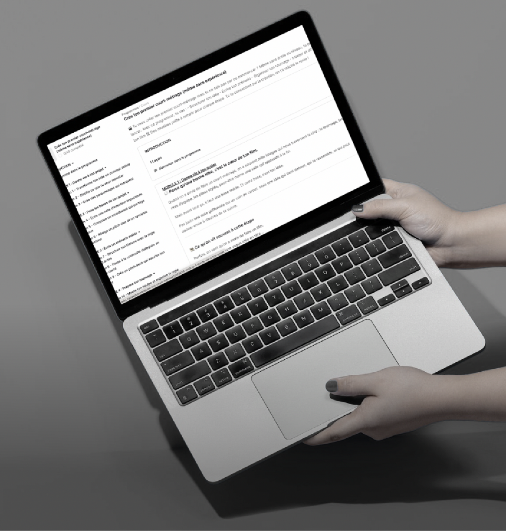 Un programme 100% en ligne avec 18 leçons claires et 18 modèles prêts à l’emploi pour passer de l’idée au tournage, étape par étape.